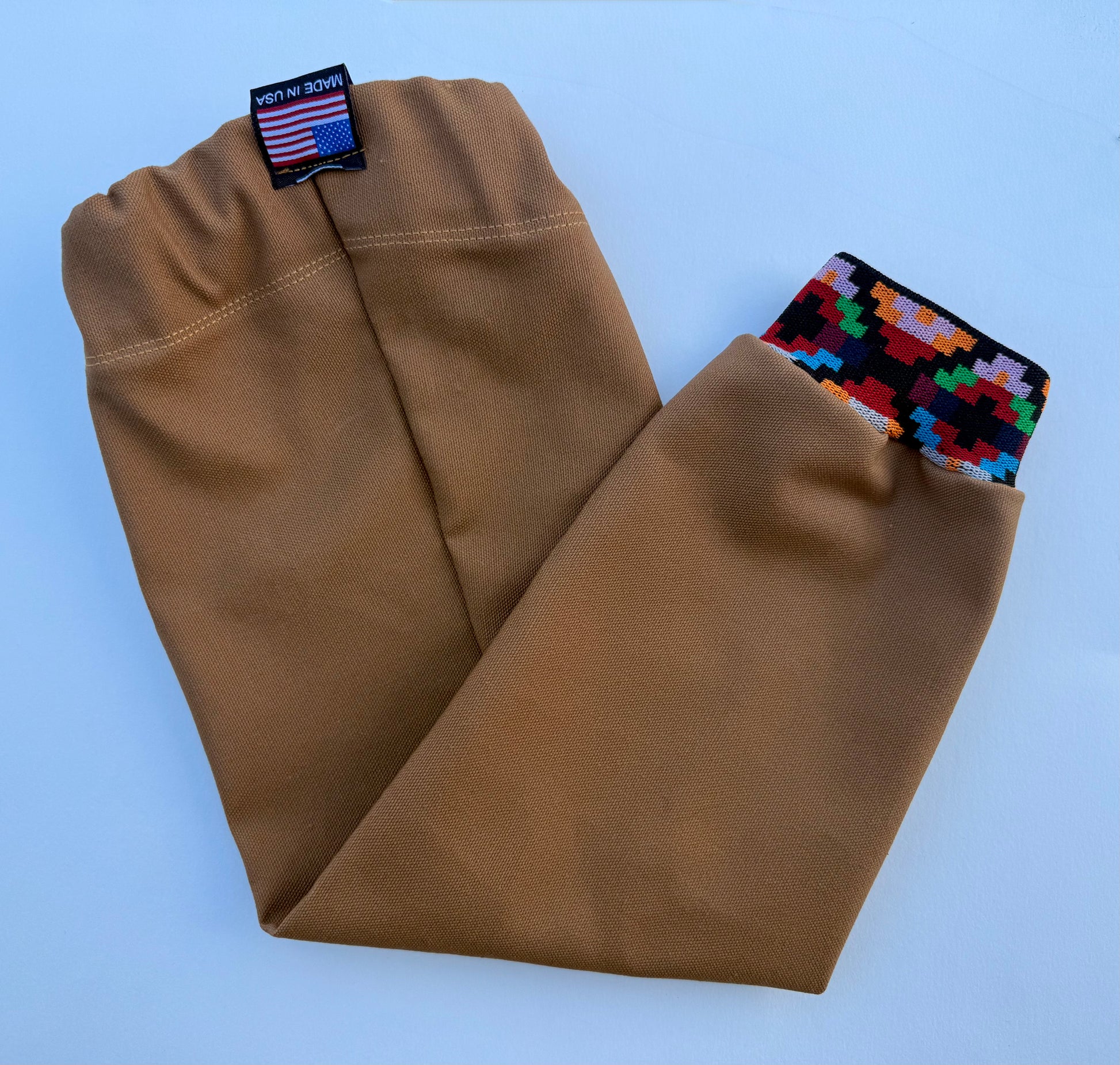 14oz FR brown canvas fabric with woven red Aztec elastic.